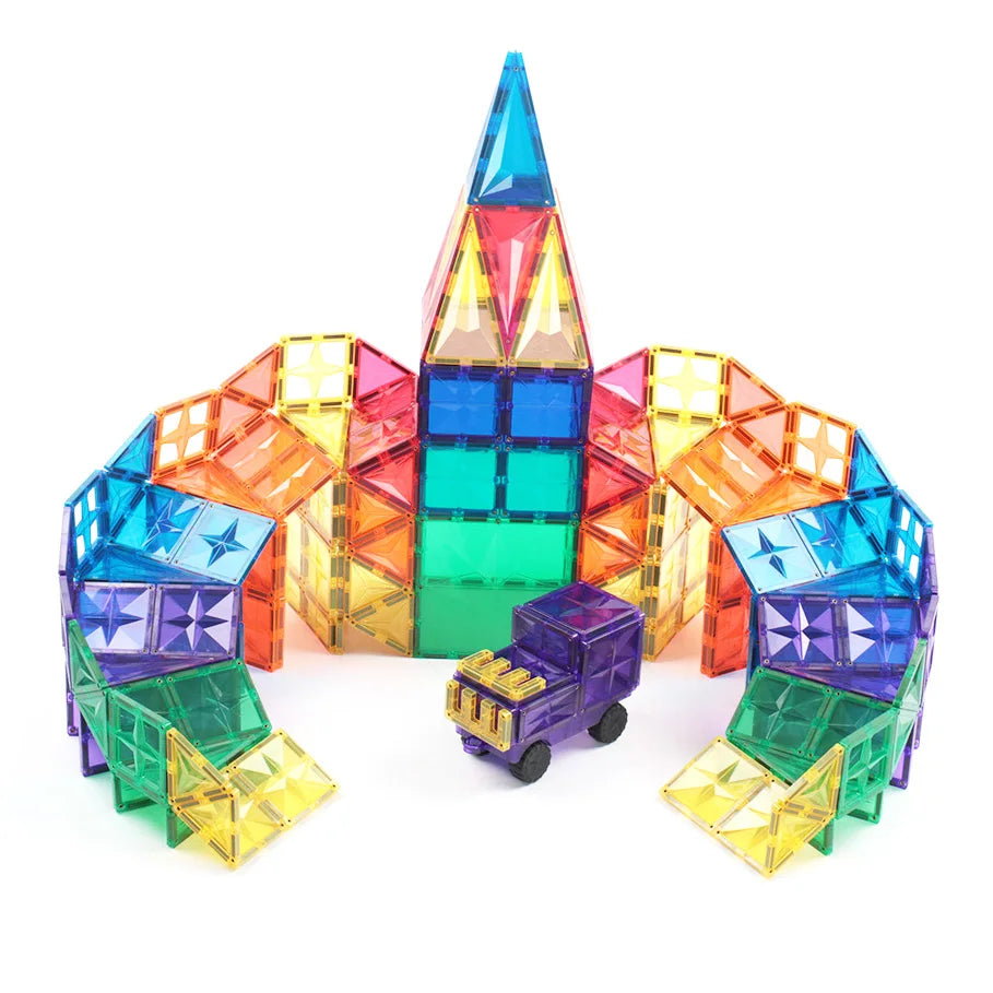 Build, learn and explore with MNTL's premium 62-piece magnetic tile set. Featuring unique star-shaped designs and vibrant translucent colours, these educational building tiles spark creativity while teaching STEAM concepts. Perfect for little hands aged 3 and up to construct castles, towers, bridges and endless imaginative creations.
