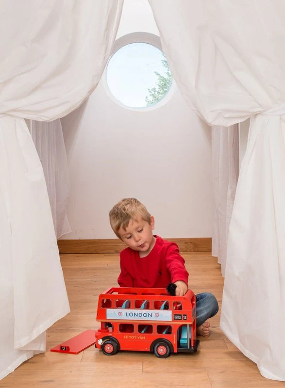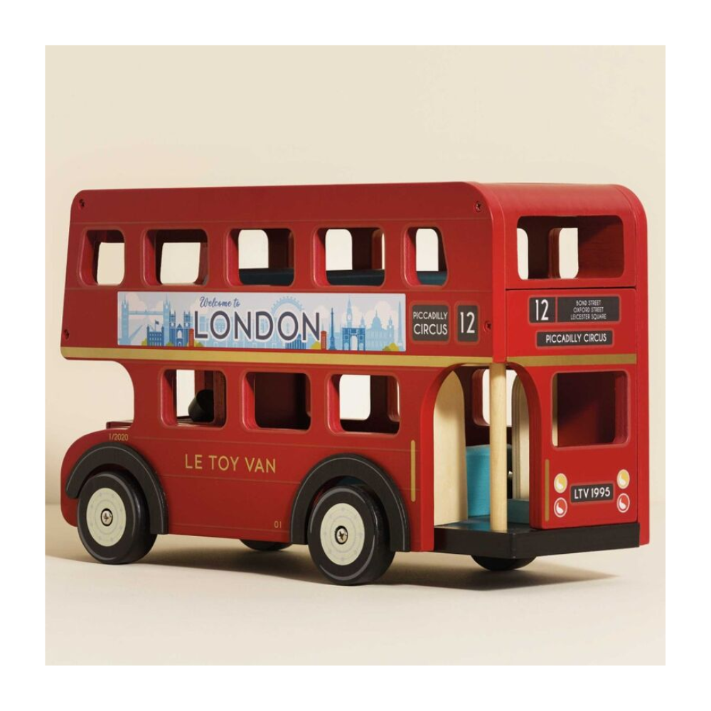 <p><strong>Please note this bus does not come with any figurines. </strong></p> <p><strong>Plastic Free Toy.  </strong></p> <p>Explore the big city with this classic bright red London bus. A wonderful gender-neutral open-ended toy crafted from sustainable rubberwood to inspire creative play. </p> <p>Features include an opening roof and top floor to allow easy access and real rubber tires.</p> <p> </p> <p><img src="https://www.kaleidoscope.com.au/assets/images/Right-start-toy-awards-winner(1).jpg" alt="" />     <img src="https://www.kaleidoscope.com.au/assets/images/junior-design-awards-2011-shortlisted.jpg" alt="" /></p> <p><em>Le Toy Van has made a pledge to craft only plastic-free toys. Keeping with this pledge this bus has been revamped and no longer comes with a Budkin driver which contained plastic. </em></p> <p>Suitable for ages: 3+ years</p> <p>Product is constructed from: Le Toy Van is a multi-award-winning toy producer who ensures fair trading at every stage of production and ethical conditions for their workforce. Their painted wooden toys are made from various materials including certified sustainable plantation rubberwood and non-toxic paint.</p> <p> </p> <h5>Package Dimensions</h5> <p class="crosses">39cm L26cm H17cm W2.9kg</p> <h5>Product Dimensions</h5> <p class="crosses">36cm L23cm H13cm W</p>