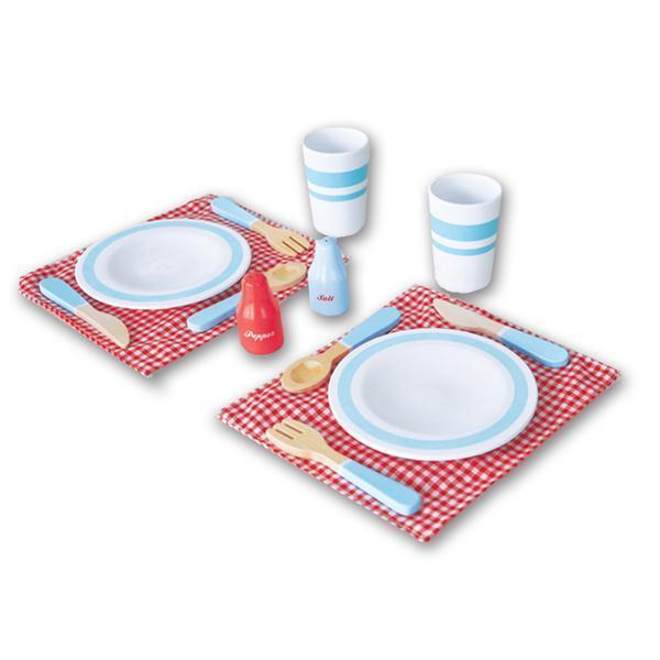 A wooden retro 14 piece dining set for two. Complete with 2 plates, 2 forks, 2 knives, 2 spoons, 2 place mats, salt and pepper pots and 2 cups. Great for imaginative play.